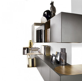 Entrambi contenitori dal design lineare e geometrico con volumi aperti e chiusi, possono dare vita sia a forme rettilinee, sia a soluzioni angolari. Difatti grazie all’elemento in metallo orientabile Partout può seguire angoli aperti e angoli chiusi creando continuità sulle pareti.