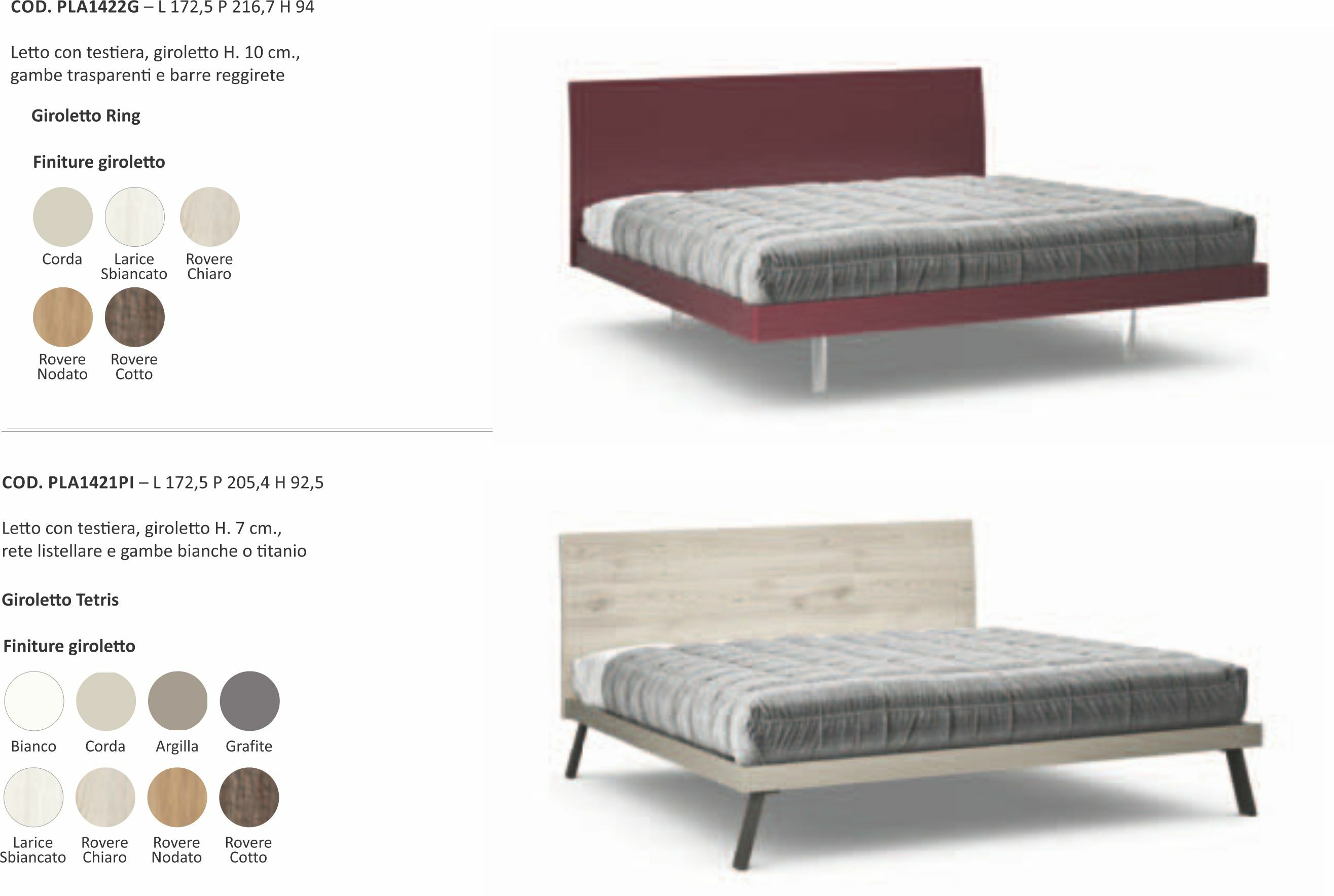 Letto con testiera e giroletto in legno. Disponibile con piedi trasparenti, legno o metallo.