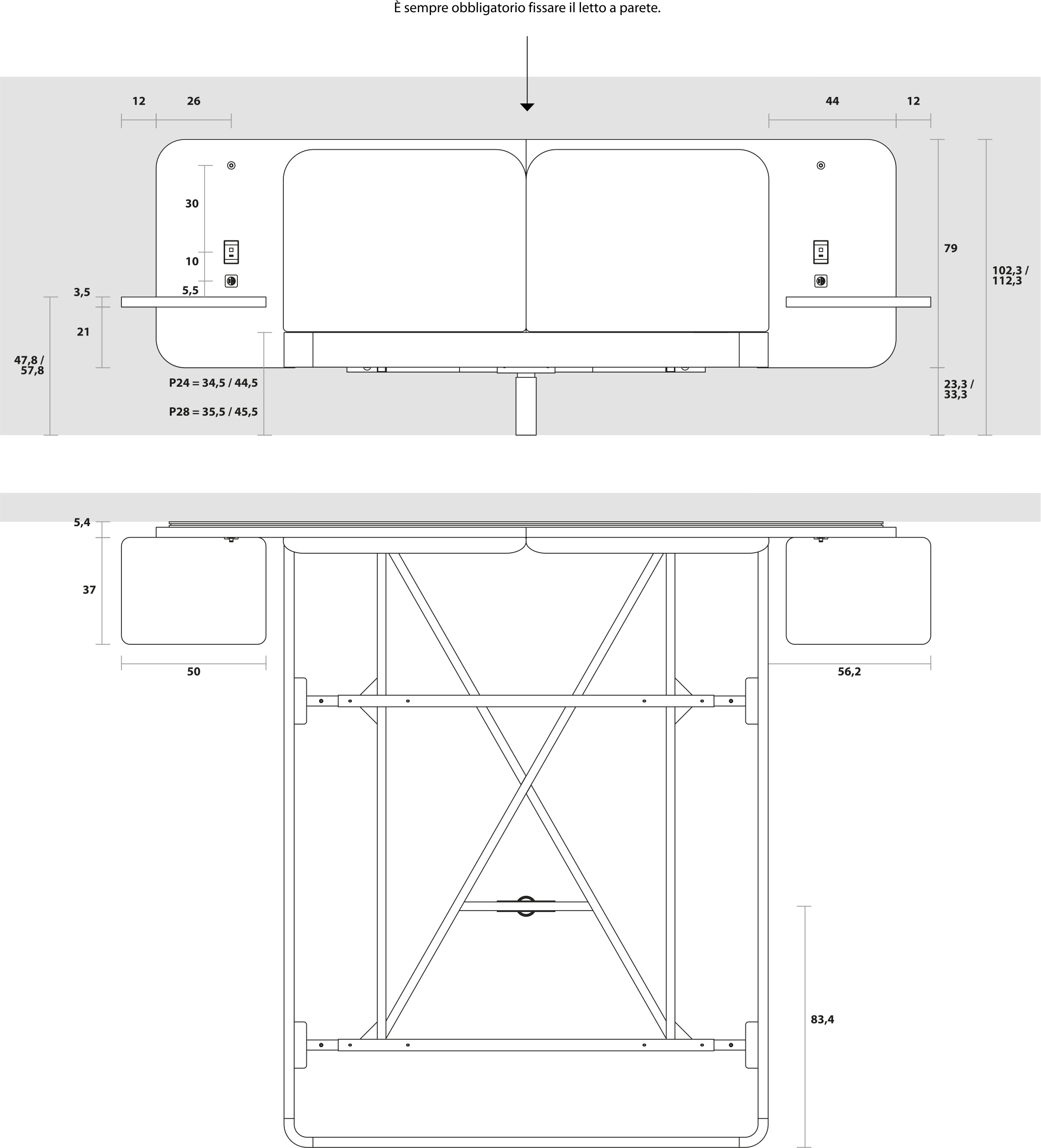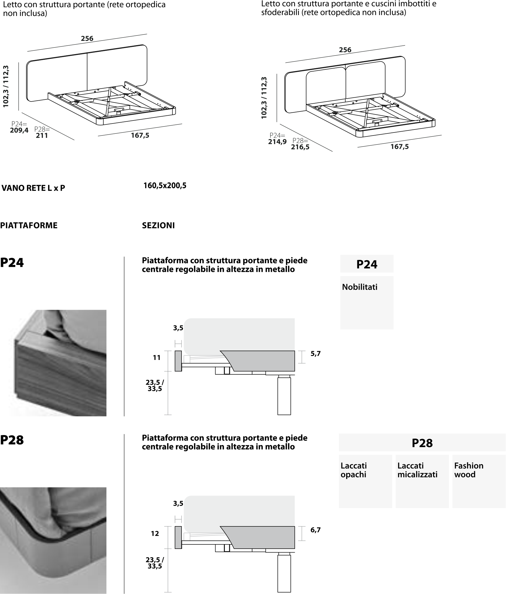 La struttura portante è solida e discreta: realizzata in legno, è sostenuta da un piede centrale in metallo verniciato nero, regolabile in altezza. Il letto deve essere obbligatoriamente fissato a parete, poiché la testiera non è retro finita, ma montata su pannelli a muro.