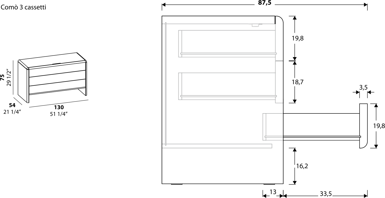 L’apertura dei cassetti segue un principio di funzionalità differenziata: il primo cassetto è dotato di una maniglia centrale in metallo, con chiusura assistita, mentre quelli inferiori si aprono tramite un pratico sistema push-pull, mantenendo pulite le linee del design. La maniglia può essere personalizzata scegliendo tra una finitura laccata opaca o micalizzata, per abbinarla perfettamente allo stile dell’ambiente.