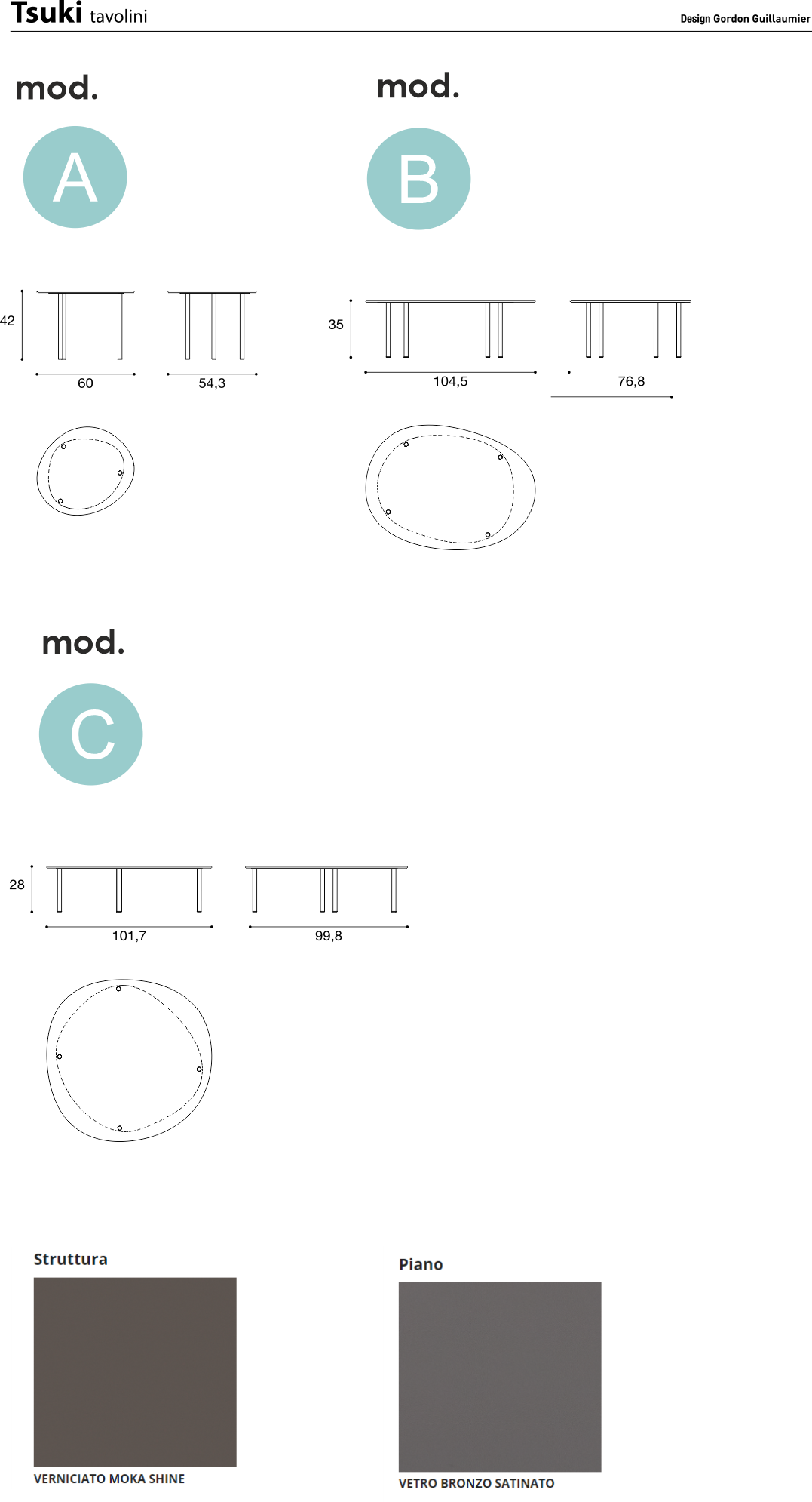 Il tavolino è composto da una struttura (basamento + gambe) in metallo verniciato moka shine e piano in vetro bronzo satinato Sp. 1 cm, temprato e filo tondo satinato