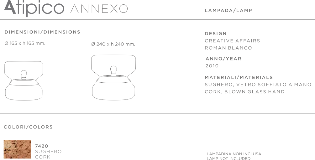 Base in sughero con vetro borosilicato soffiato a mano. Impianto elettrico certificato.