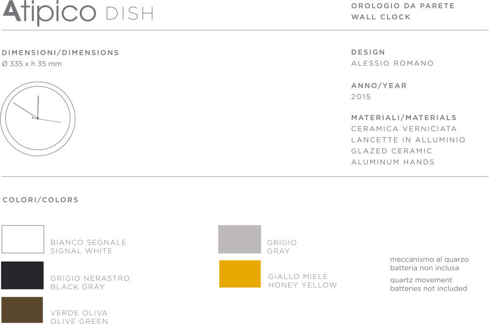 Segnano il ricordo di ore felici trascorse in luoghi lontani, o familiari. Trascendono la loro funzione e vengono elevati a decorare i muri delle stanze conviviali, a comunicare prestigio e ricchezza. Una reminiscenza che si esprime in chiave post-moderna, contemporanea, in un piatto leggero, essenziale, un disco che segna le ore, i minuti del giorno.