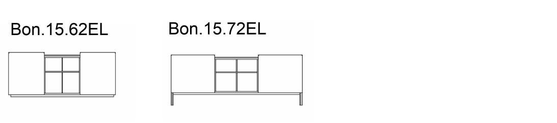 Credenza 15.62EL con struttura in legno, composta da due ante a battente, ripiani interni in Cristallo trasparente, vano a giorno centrale in legno impiallacciato, fianchi e ante in legno laccato decorato, top a scelta. Zoccolo in Acciaio laccato.