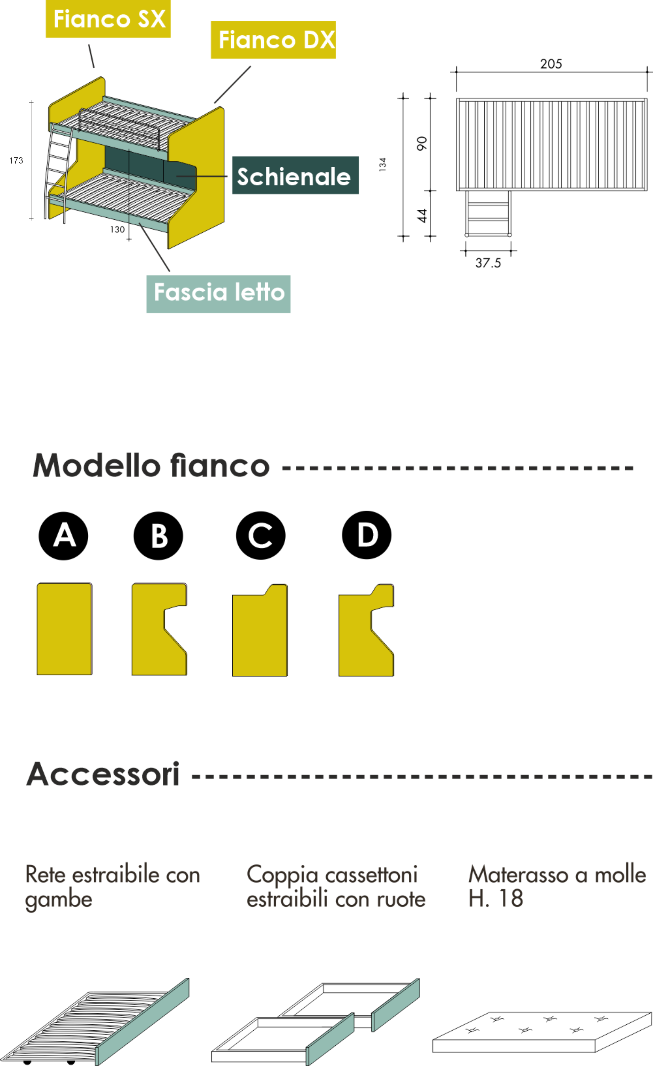 Rete estraibile e cassettoni sono in tinta con la fascia del letto, specificare nel campo NOTE eventuale finitura/colorazione differente