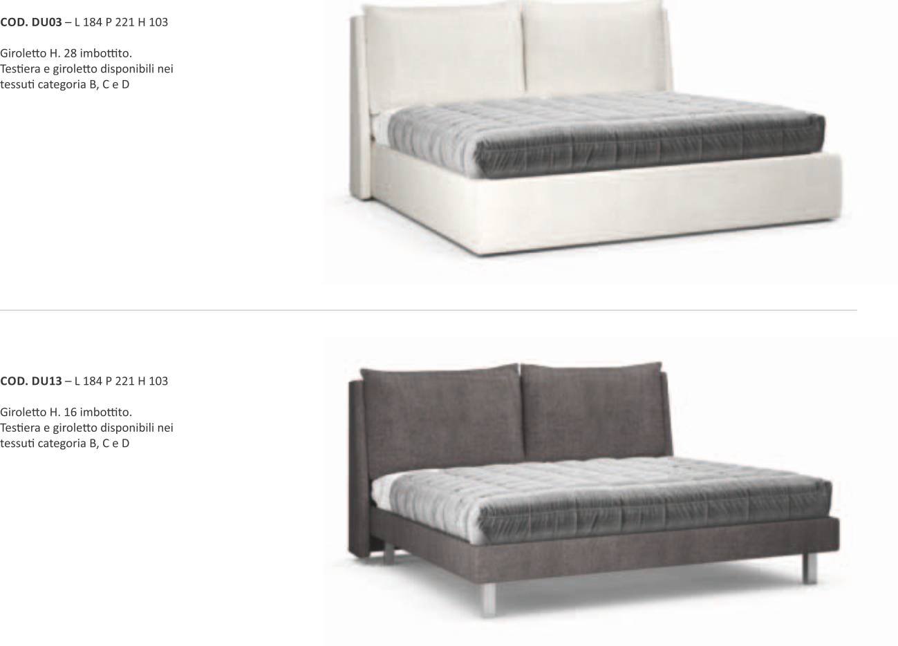 Letto con testiera imbottita e giroletto in tessuto