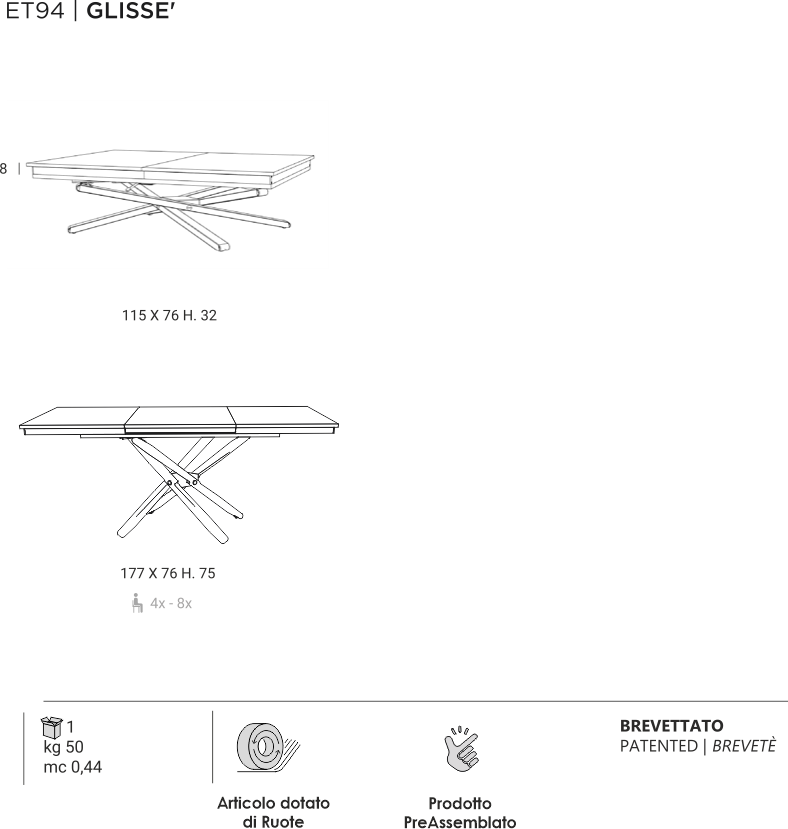 Glissè è un tavolino trasformabile con basamento incrociato in metallo e top in ecolegno. Ideale per spazio conviviali, data anche la facilità di apertura con allunga nascosta che permette l’allungamento fino a 177 cm.