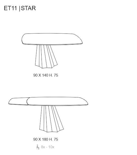 La base asimmetrica in lamiera piegata, dal design sofisticato, dona al tavolo un carattere vivace e contemporaneo, creando un perfetto equilibrio tra stabilità ed essenzialità. Il piano, disponibile in diverse finiture, si apre con un ingegnoso meccanismo girevole che consente di estendere la superficie con un semplice gesto, aggiungendo posti a tavola.
