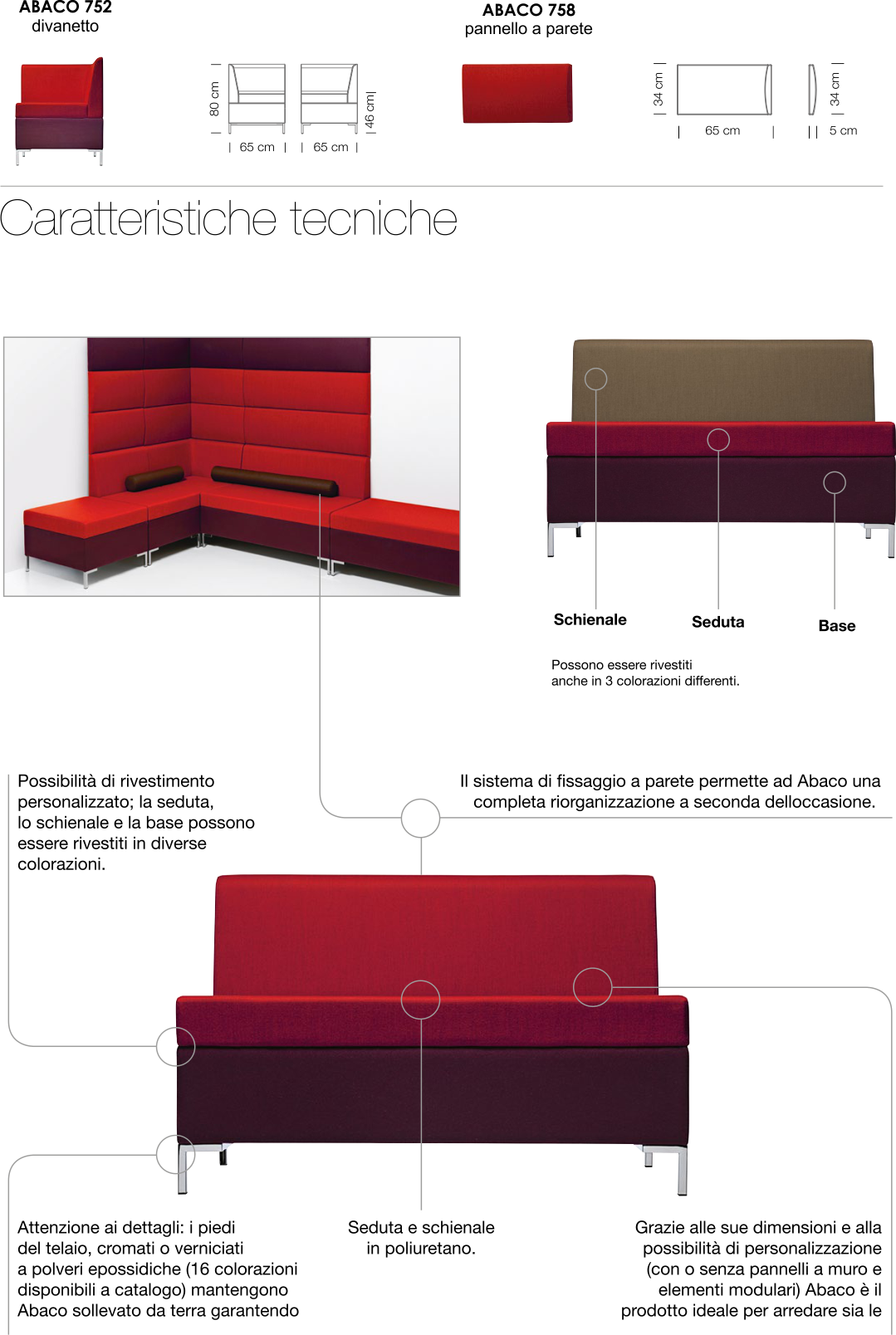 Seduta e schienale imbottiti, rivestimento in tessuto, telaio in tubo acciaio. Sistema sedute multiple, modulo angolare.