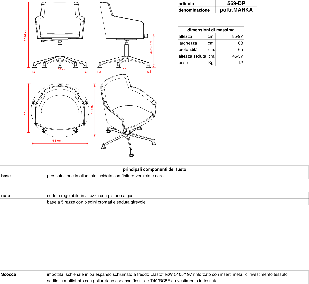 Seduta e schienale imbottiti, rivestimento in tessuto, telaio in alluminio a 5 razze.