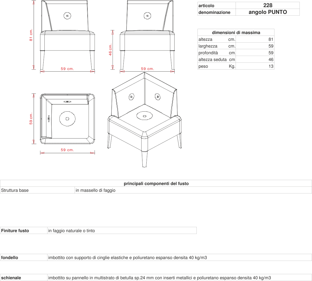 Seduta angolare con telaio a 4 gambe in faggio. Sedile e schienale in tessuto. Modulo angolare.