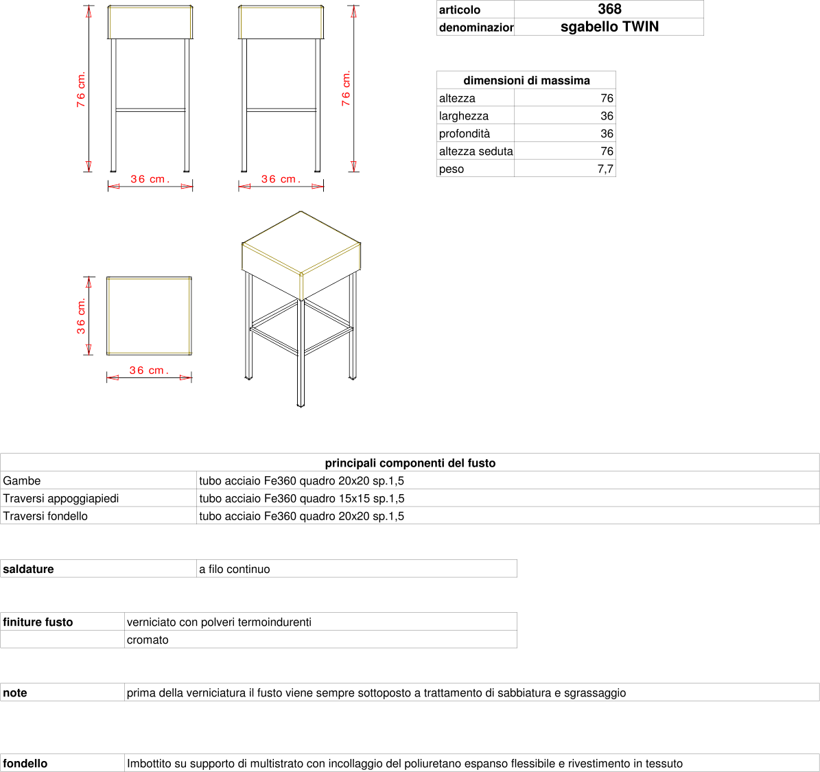 Telaio a 4 gambe in tubo acciaio, sedile in tessuto.