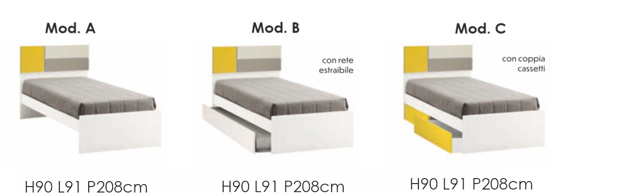 Letto FUSION, singolo con testiera e giroletto in legno. Componibile con coppia di cestoni e rete estraibile.