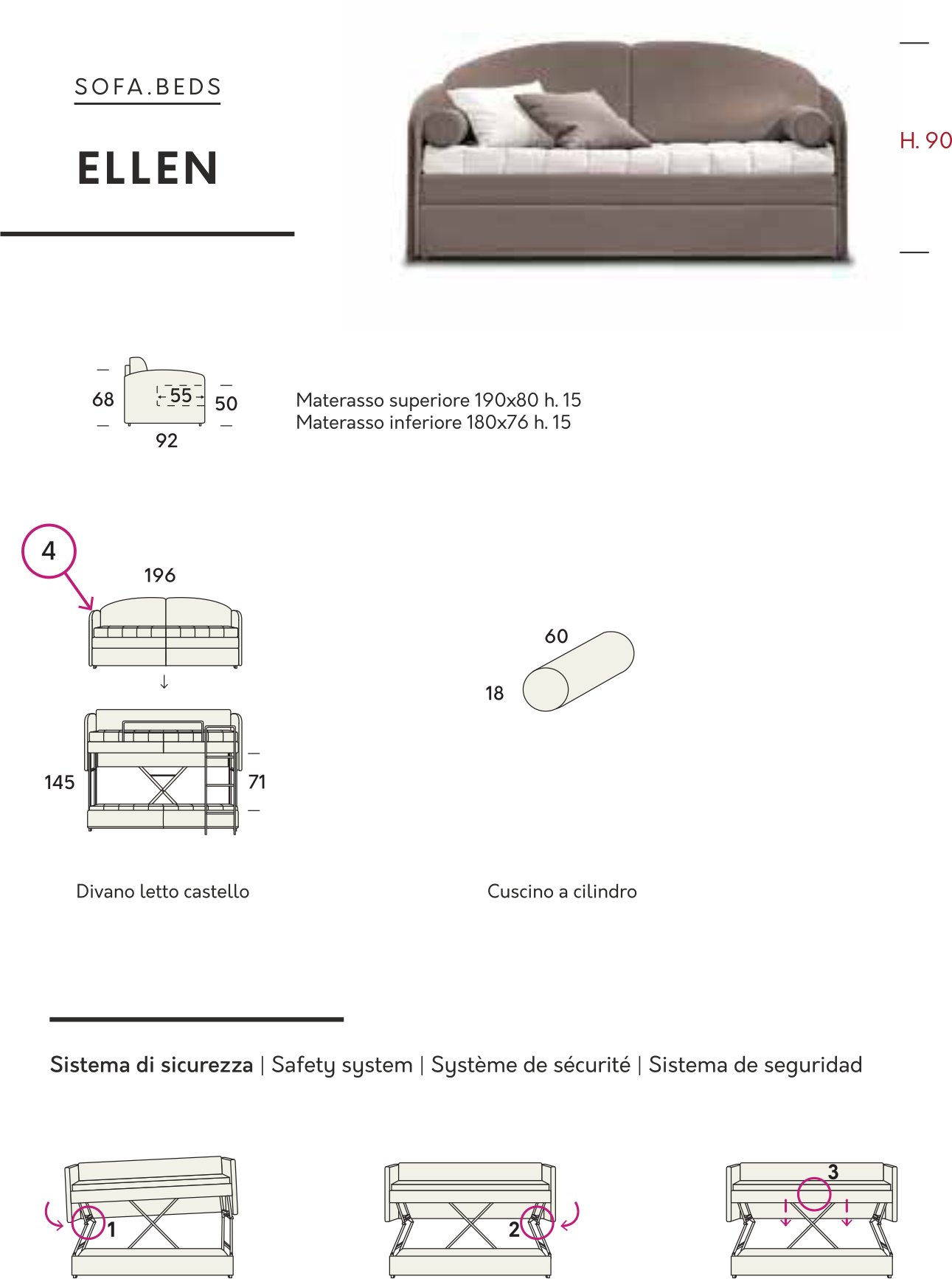 Funzionale senza rinunciare al look. Con Ellen il letto in più è senza ingombro grazie al meccanismo a castello. Tutto è studiato alla perfezione per la massima comodità e tranquillità: il meccanismo con tre sicurezze trasforma il divano in letto e viceversa, mentre la rete esce di 30 cm per facilitare la preparazione del letto.