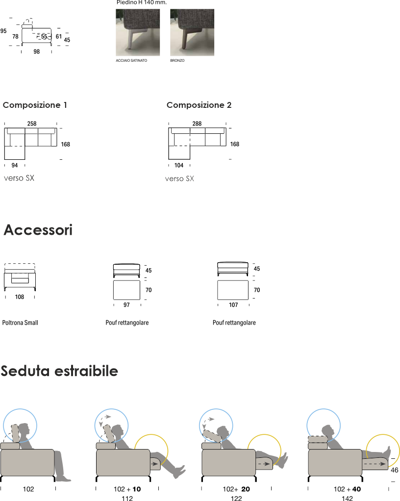 Fred diventa la star di ogni ambiente grazie al suo design raffinato, ma garbato, con il piedino alto che dona delicatezza alla struttura, ma che facilita anche le pulizie di casa. Poggiatesta ergonomico regolabile manualmente in 15 diverse posizioni per un maggiore appoggio. Seduta estraibile opzionale.