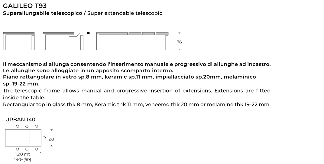 Superallungabile Telescopico. Il telaio si allunga consentendo l’inserimento manuale e progressivo di allunghe ad incastro. Le allunghe sono alloggiate in un apposito scomparto interno.