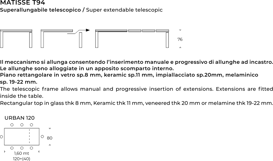 PIANI E SPESSORI: melaminico sp.19-20 mm; melaminico 45° sp.22 mm; impiallacciato bordo inclinato sp.20 mm; vetro sp.8 mm; Keramic opaco sp.11 mm (8 mm vetro + 3 mm ceramica oppure 6 mm vetro + 5 mm ceramica); Keramic lucido sp.11 mm (6 mm vetro + 5 mm ceramica).