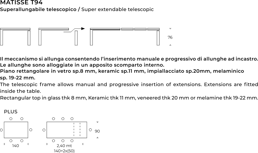 Melaminico, laminato materico e legno impiallacciato sono corredati di allunghe dello stesso materiale. I piani in vetro e vetroceramica sono corredati di allunghe in laminato/melaminico di colore coordinato.