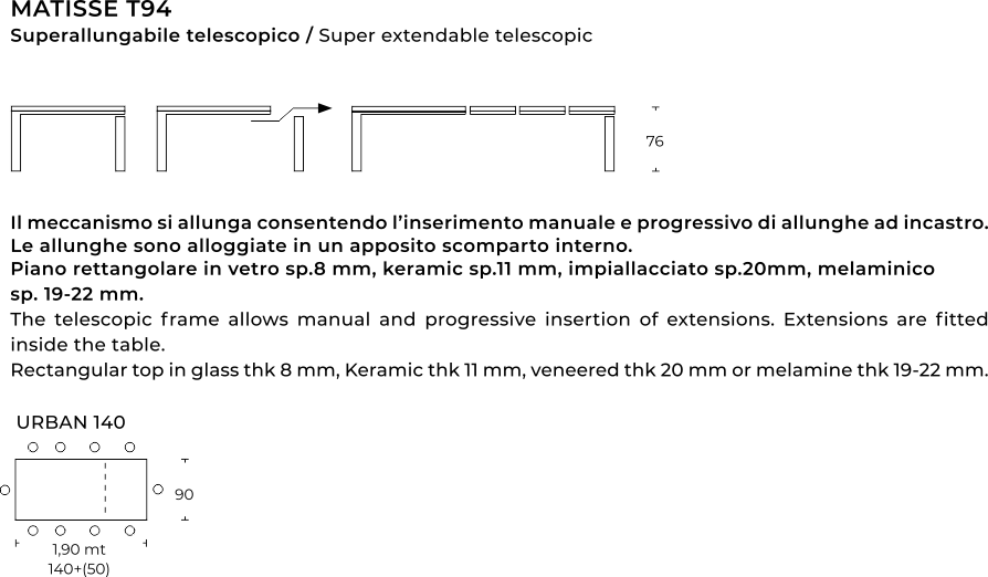 Melaminico, laminato materico e legno impiallacciato sono corredati di allunghe dello stesso materiale.