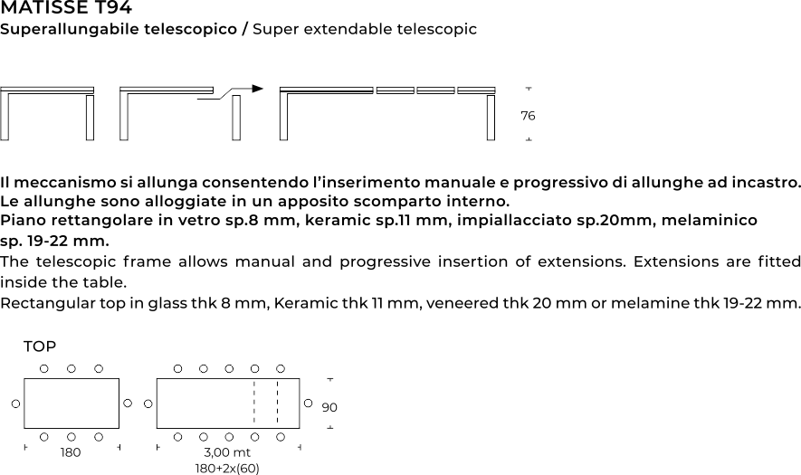 PIANI E SPESSORI: impiallacciato bordo inclinato sp.20 mm; vetro sp.8 mm; Keramic opaco sp.11 mm (8 mm vetro + 3 mm ceramica oppure 6 mm vetro + 5 mm ceramica); Keramic lucido sp.11 mm (6 mm vetro + 5 mm ceramica).