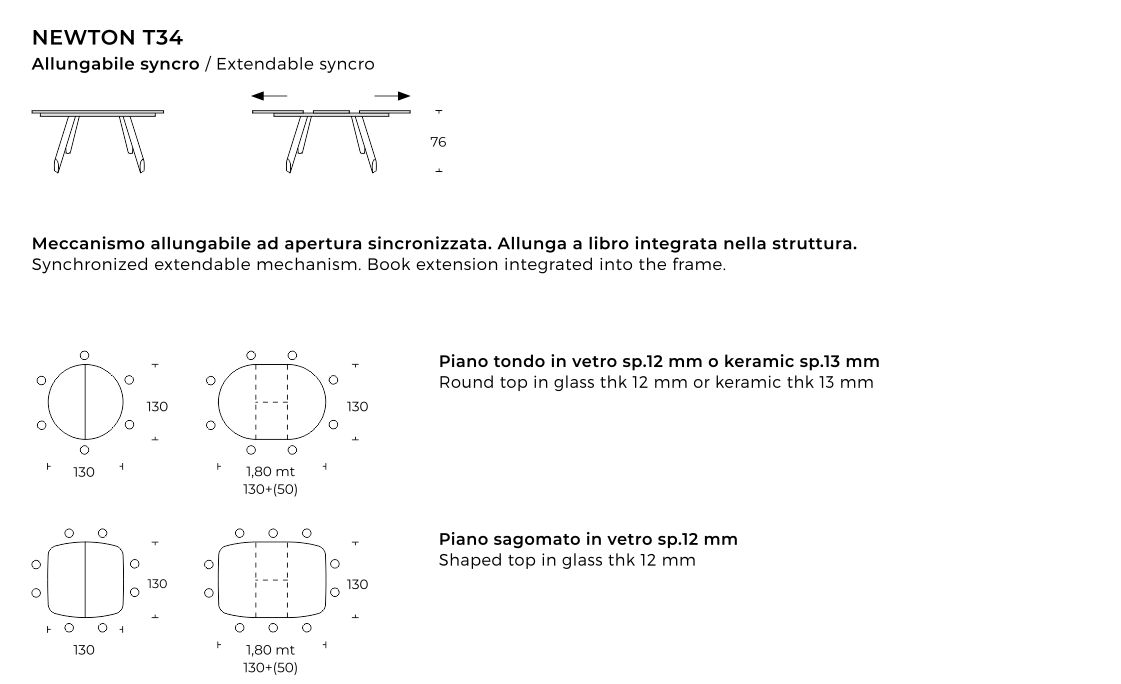 C’è uno slancio energico nelle gambe di Newton, che parte dal basso e si propaga nella loro sezione tonda e vigorosa. Le estremità delle gambe, disegnate a scalpello, poggiano sul pavimento come i piedi di due ballerini protesi armonicamente verso l’alto. E della danza questo tavolo ha la stessa forza e stabilità, qualità che si compongono nel piano tondo in vetroceramica, di cui un elemento può allungare l’ampiezza.