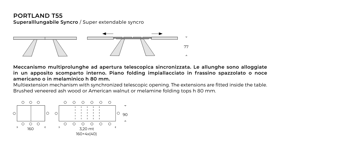 - Superallungabile Syncro. Piano folding H80mm in legno impiallacciato, laccato o melaminico. Telaio multiprolunghe ad apertura telescopica sincronizzata in acciaio/alluminio. Le allunghe sono alloggiate in un apposito scomparto interno.