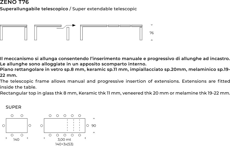 PIANI E SPESSORI: melaminico sp.19-20 mm; melaminico 45° sp.22 mm; impiallacciato bordo inclinato sp.20 mm; vetro sp.8 mm; Keramic opaco sp.11 mm (8 mm vetro + 3 mm ceramica oppure 6 mm vetro + 5 mm ceramica); Keramic lucido sp.11 mm (6 mm vetro + 5 mm ceramica).