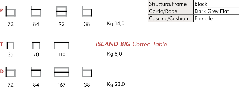Coordinato con struttura in alluminio e rivestimento in corda polyolefin, composto da un divano due posti, due poltrone un tavolino con piano in alluminio. Cuscineria in tessuto acrilico e gomma resistente all’acqua