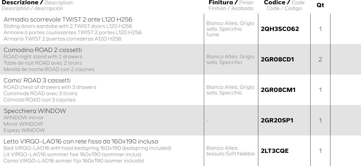 - Comodini ROAD con 2 cassetti (x2): struttura in Bianco Altea e Grigio Seta, funzionali e coordinati con il resto dell’arredo per una continuità visiva impeccabile.