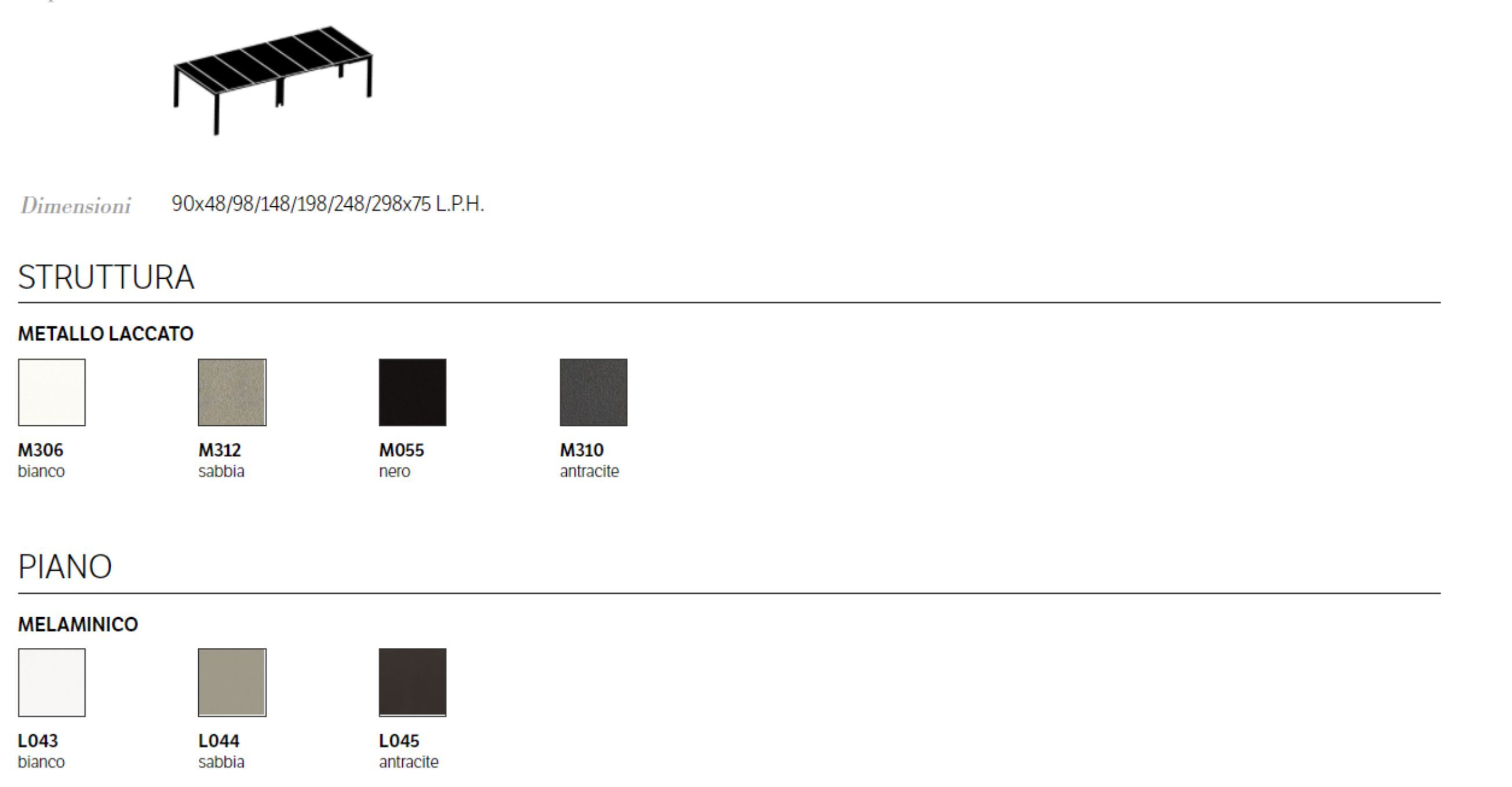 Tavolo consolle con struttura in Acciaio laccato, piano e prolunghe in melaminico.