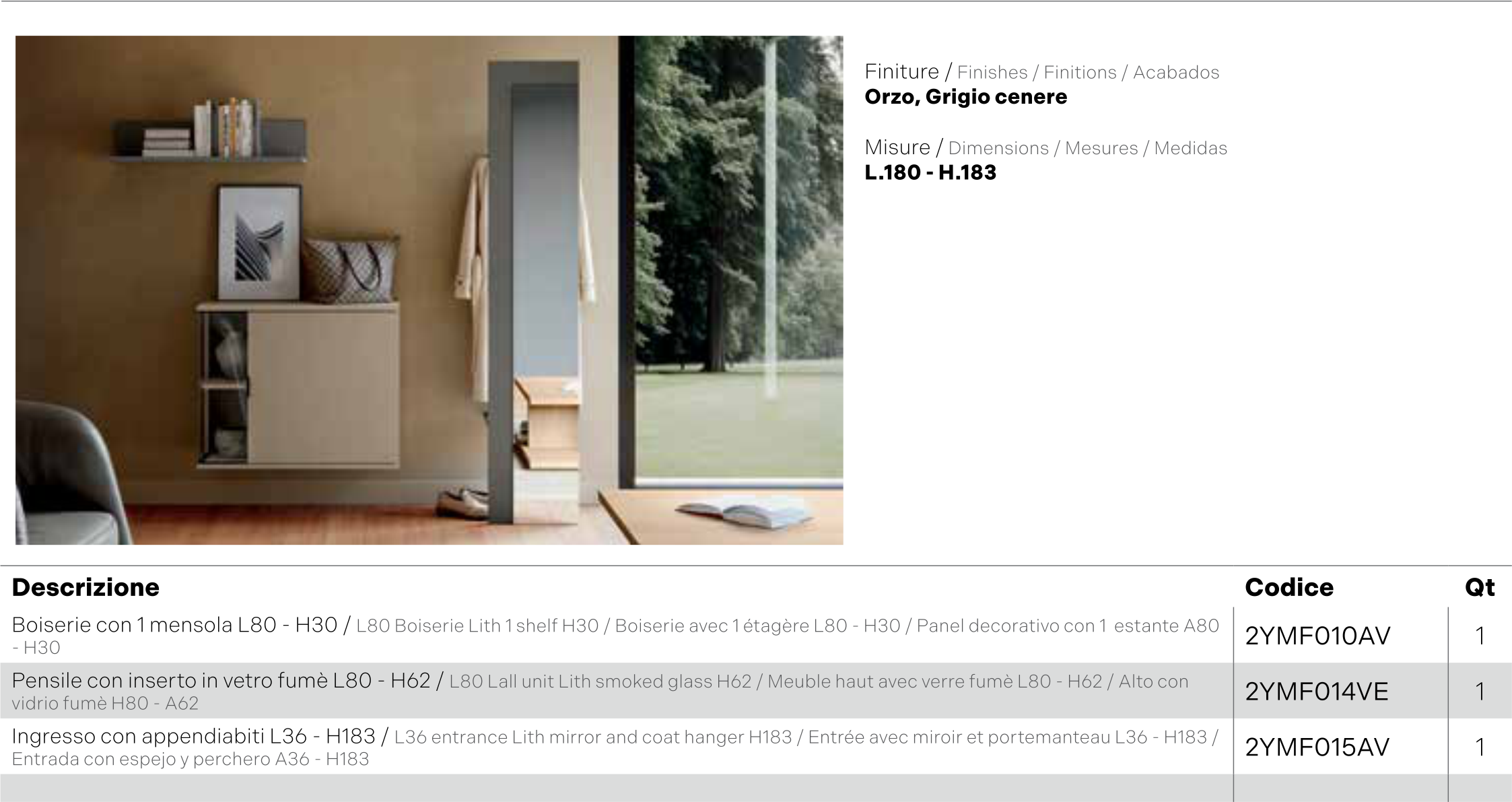 Una soluzione d’arredo raffinata e funzionale per l’ingresso di casa. Caratterizzata da linee essenziali e finiture contemporanee, questa composizione include un pensile sospeso con dettaglio in vetro fumé, una boiserie con mensola decorativa e un pratico specchio a tutta altezza con appendiabiti integrato.