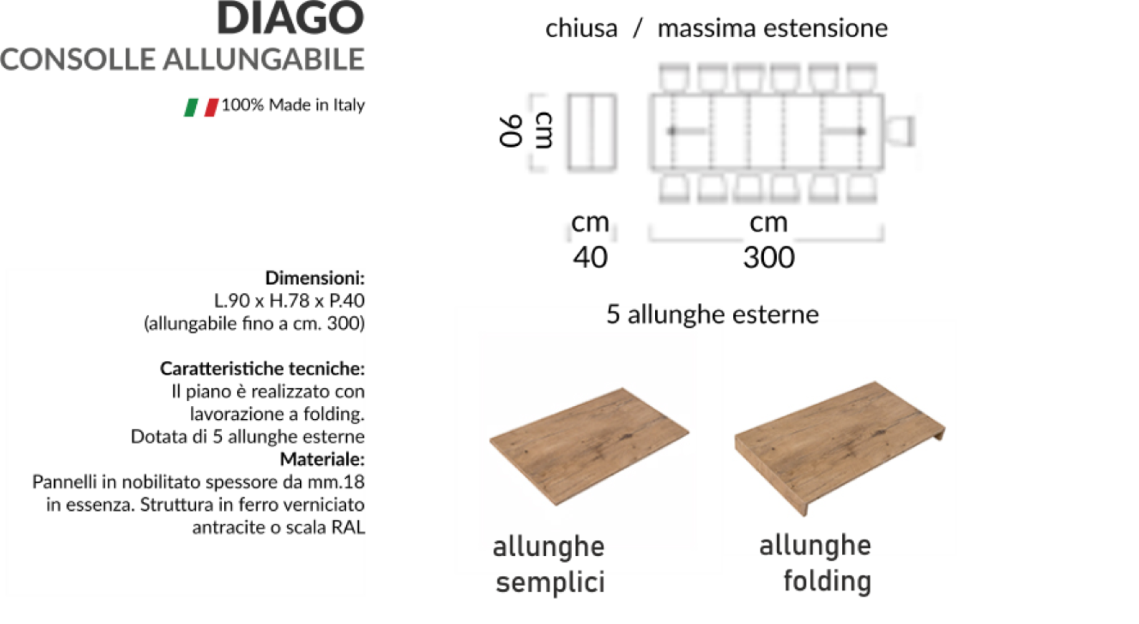 Il piano e le allunghe, nelle finiture bianco frassino, quercia natura, cemento e noce sono in microparticelle di legno rivestito, mentre il piano in abete natura e abete tinto è in legno listellare.