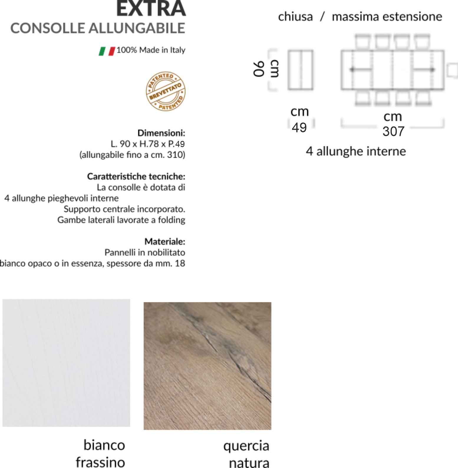 Consolle Extra è un modello di consolle brevettato: il supporto del piano (il piano della consolle quando completamente aperta ha bisogno di un sostegno) fa parte della consolle e le allunghe si ripongono all'interno delle gambe.