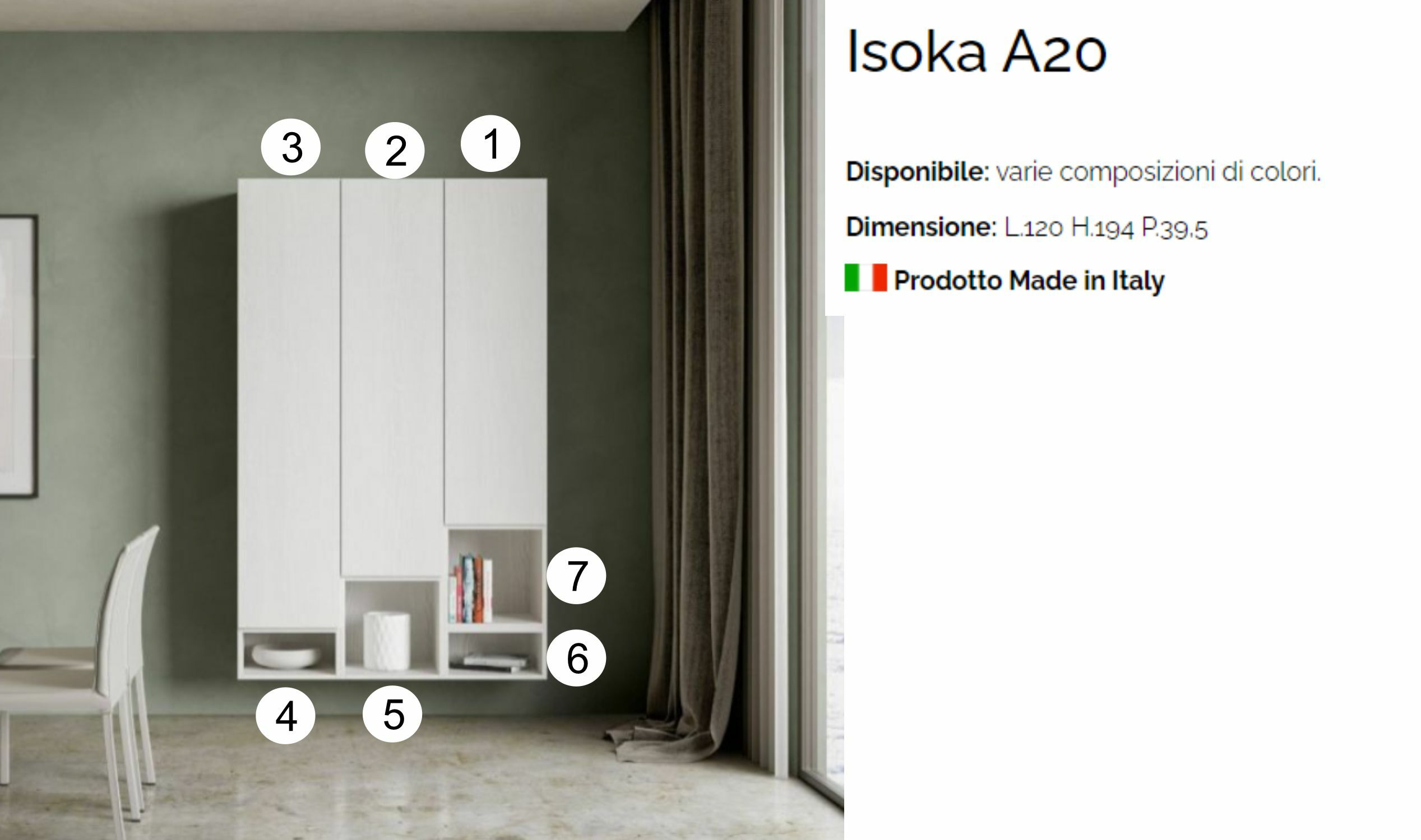 Comprende: n.1 pensile verticale 134cm; n.1 pensile verticale 154cm; n.1 pensile verticale 174cm; n.2 pensili a giorno L.40 H.20; n.2 pensili cubo a giorno 40cm.