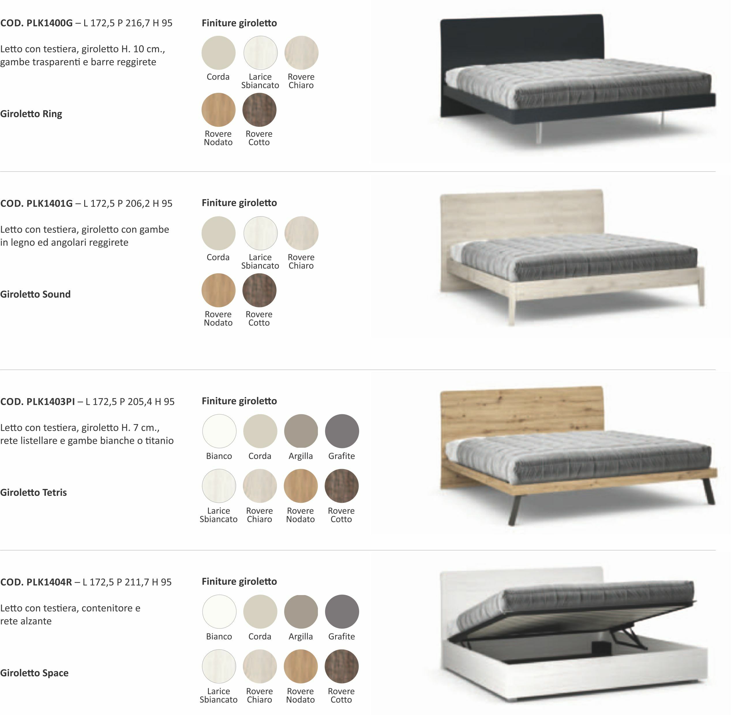 Letto con testiera e giroletto in legno. Disponibile con piedi trasparenti, legno o metallo. Pannelli spessore 2,2cm