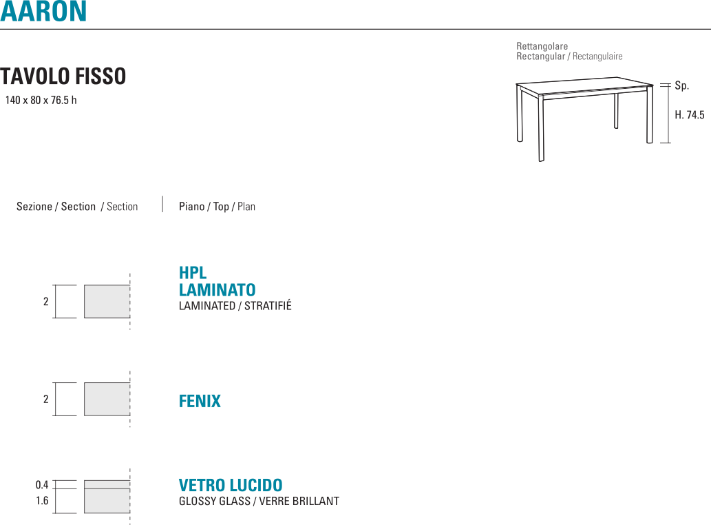 Gamba in alluminio anodizzato in zero chimico, alluminio laccato a polvere epossidica. Guida in alluminio su pattini in resina acetalica (POM). Piano spessore 20 rivestito in laminato HPL, FENIX, con vetro laccato lucido supportato.