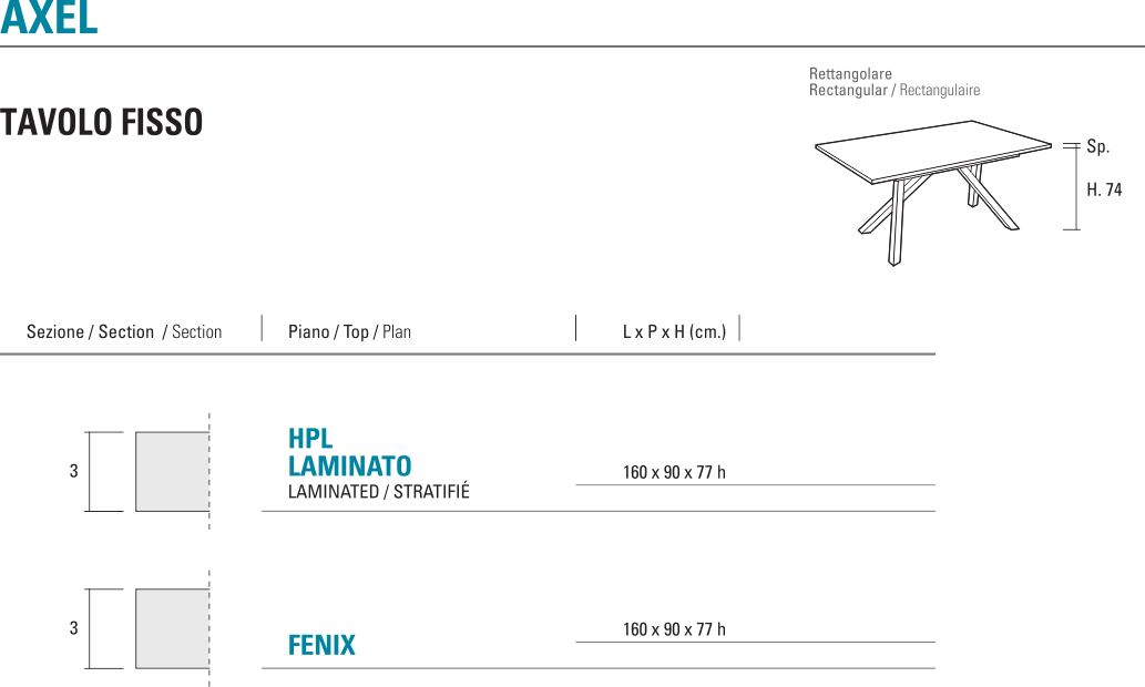 Gambe in metallo con forma a “X” verniciato a polveri epossidiche. Piani in truciolare sp.30 mm. Rivestiti in Hpl o Fenix.