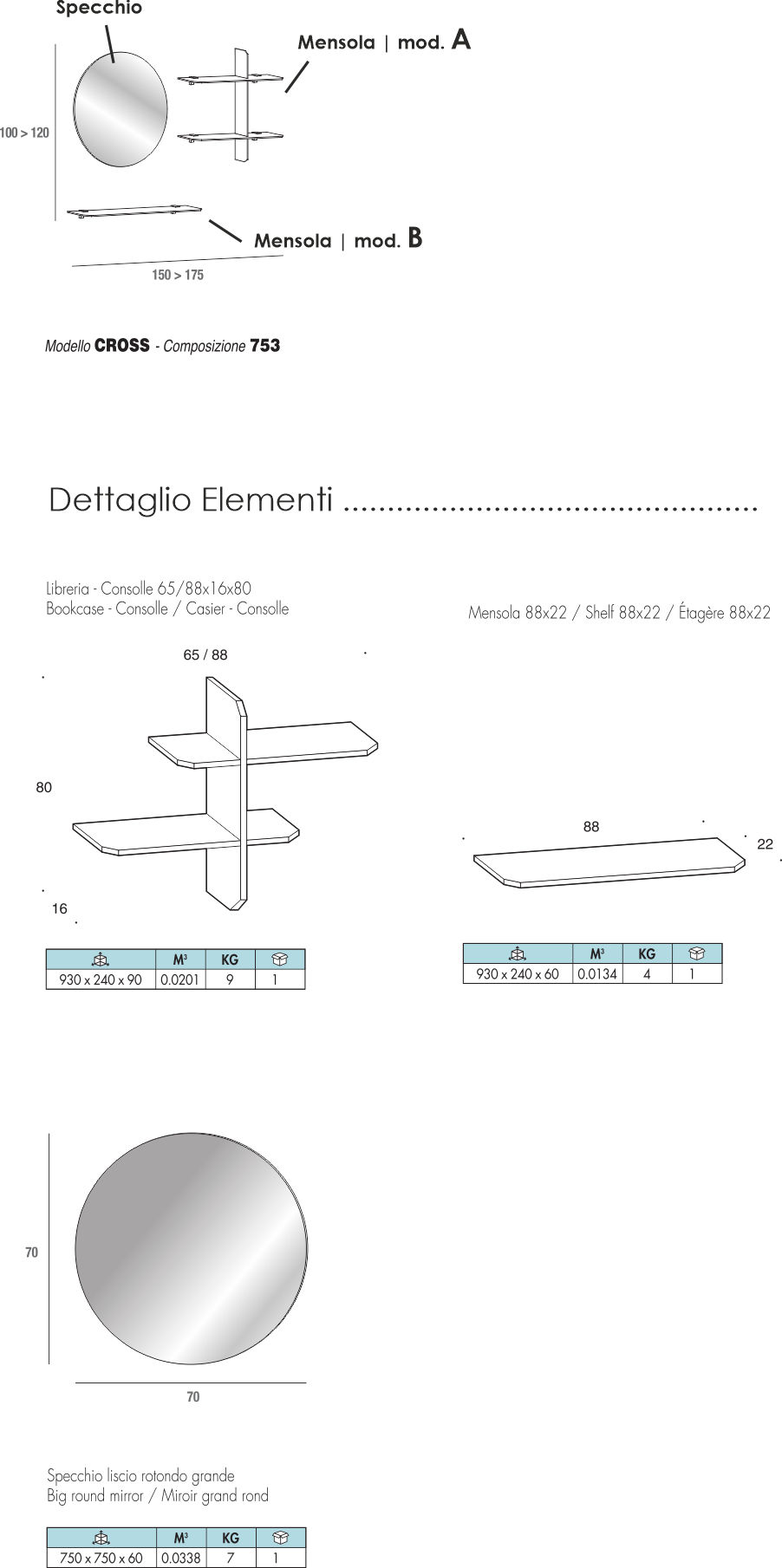 Programma realizzato da specchio liscio rotondo e composizione mensole in HPL o Fenix