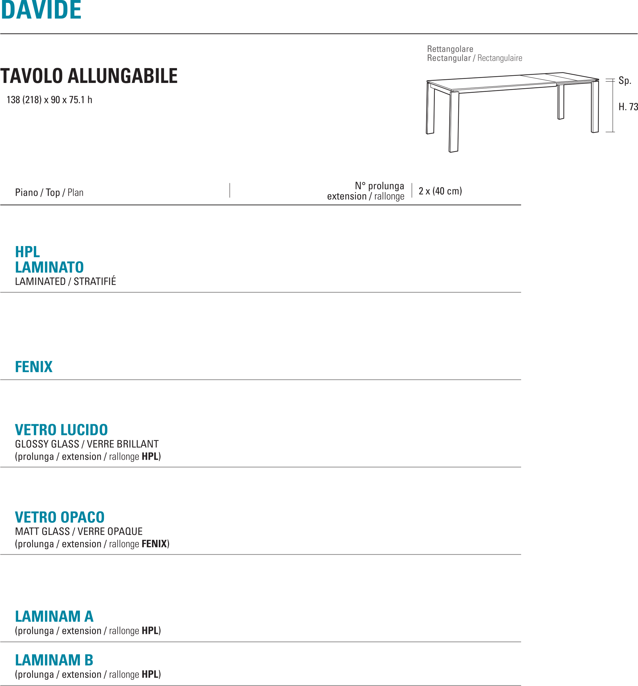 Gamba in metallo laccato bianco a polveri epossidiche. Guida in alluminio anodizzato. Piani e prolunghe in vetro da 10mm temperato supportato da pannello melamminico o pannello da 14 mm rivestito in HPL supportato da pannello melamminico.
