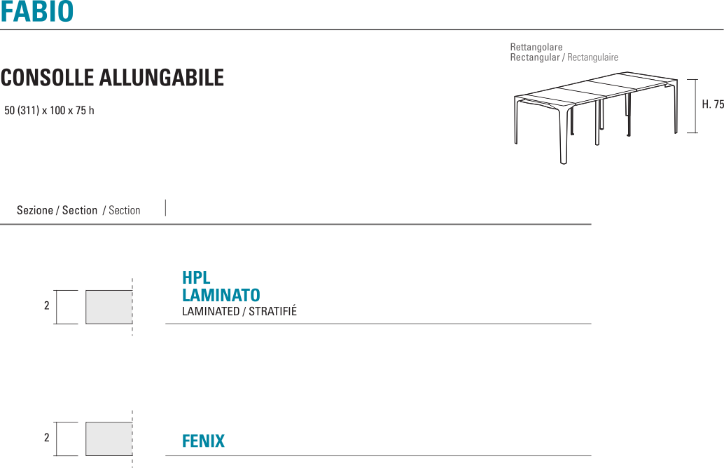 Consolle con struttura in metallo verniciato a polveri epossidiche con guida in alluminio e gamba centrale girevole in metallo verniciato a polveri. Piani rivestiti in HPL o Fenix ntm bordati con bordi in ABS o Unicolor con colle poliuretaniche reattive o, dove disponibile, con bordo in PP laser-fusion.