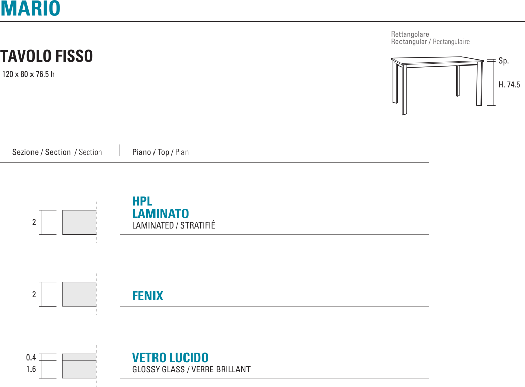 Gamba in alluminio anodizzato in zero chimico, alluminio laccato a polvere epossidica o in frassino tinto bianco. Guida in alluminio su pattini in resina acetalica (POM). Piano spessore 20 rivestito in laminato HPL, FENIX, con vetro laccato lucido supportato, prolunghe rivestite in HPL, laminam e vetro opaco.