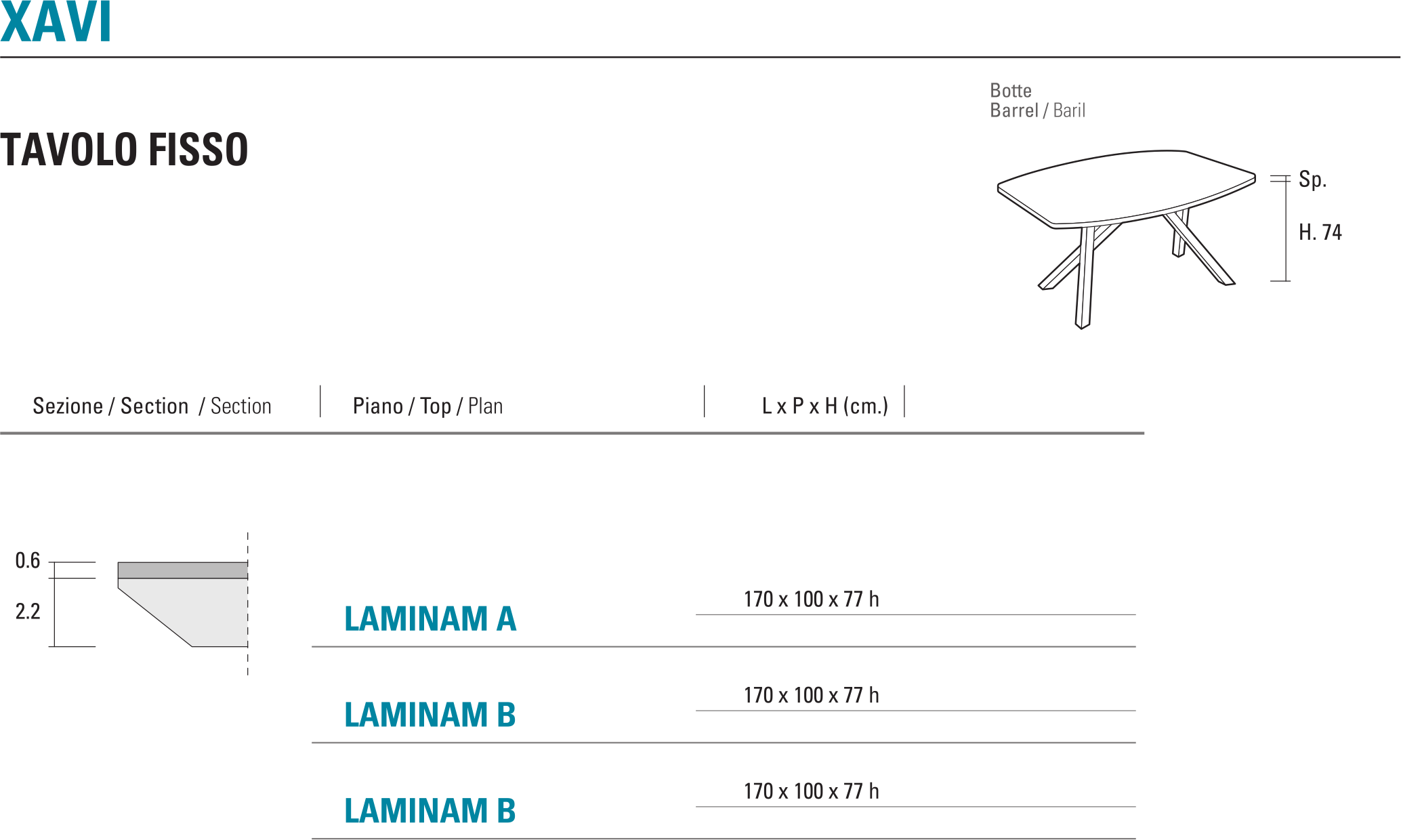 Gambe in metallo con forma a “X” verniciato a polveri epossidiche. Piani in truciolare sp.20 mm. Rivestiti in Hpl o Fenix.