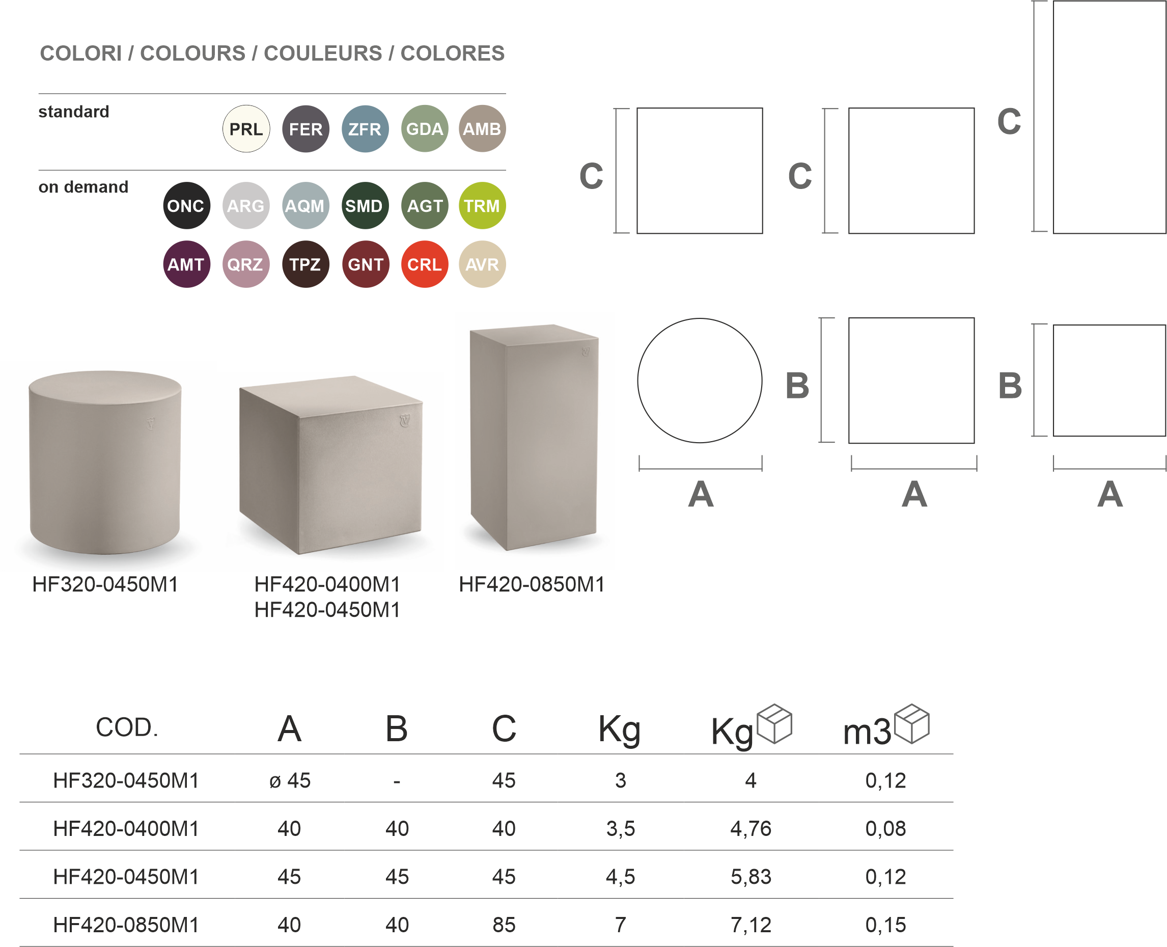 Colorati “passe-partout” dalle molteplici funzionalità. Tre forme diverse - cubo, cilindro e cubo alto – declinate in tre funzionalità diverse – pouf, tavolino e stand: complementi funzionali e versatili dai colori vibranti e dalle linee nette e pulite, in grado di arredare e disegnare gli spazi, donando un tocco di originalità ad ogni ambiente.