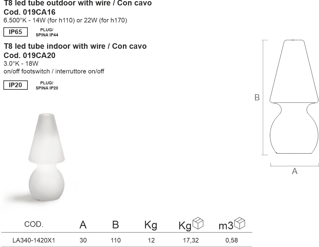 Questa lampada da terra in polietilene è ideale per illuminare e arredare con la sua luce fredda i giardini e le ambientazioni esterne, garantendo durabilità e performance ottimali in qualsiasi condizione climatica. Allo stesso tempo, con luce calda, è in grado di creare un'atmosfera accogliente e raffinata in spazi indoor, grazie alla sua forte presenza decorativa. Le versioni indoor sono equipaggiate con interruttore a pedale.