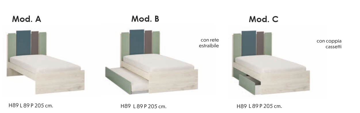 Letto MIX, singolo con testiera e giroletto in legno. Componibile con coppia di cestoni e rete estraibile. Rete ortopedica a doghe inclusa