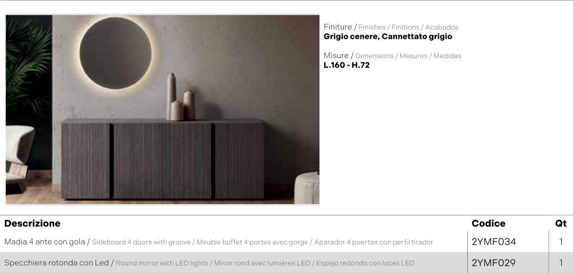 Questa composizione moderna ed elegante si distingue per il design essenziale e i materiali di tendenza. La madia a 4 ante con apertura a gola in finitura Grigio cenere e frontali cannettati offre capienza e stile, mentre la specchiera rotonda con illuminazione LED integrata dona un tocco decorativo e funzionale, ideale per valorizzare l'ingresso, il soggiorno o la zona pranzo.