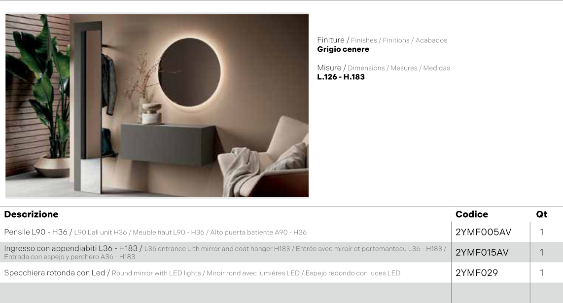 Eleganza e funzionalità si incontrano in questa composizione per ingresso dal design contemporaneo. La finitura in Grigio cenere aggiunge un tocco sofisticato, mentre i singoli elementi – pensile sospeso, specchiera rotonda LED e pannello appendiabiti con specchio – creano un ambiente ordinato, luminoso e accogliente fin dal primo sguardo.