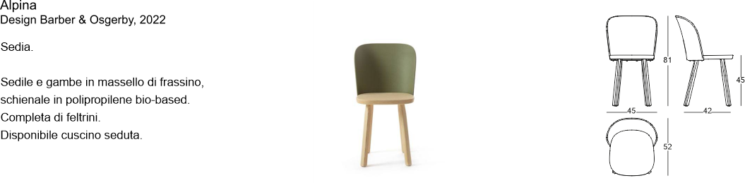 Materiali: sedile e gambe in massello di frassino, schienale in polipropilene bio-based. Disponibile cuscino seduta in poliuretano espanso rivestito in tessuto.