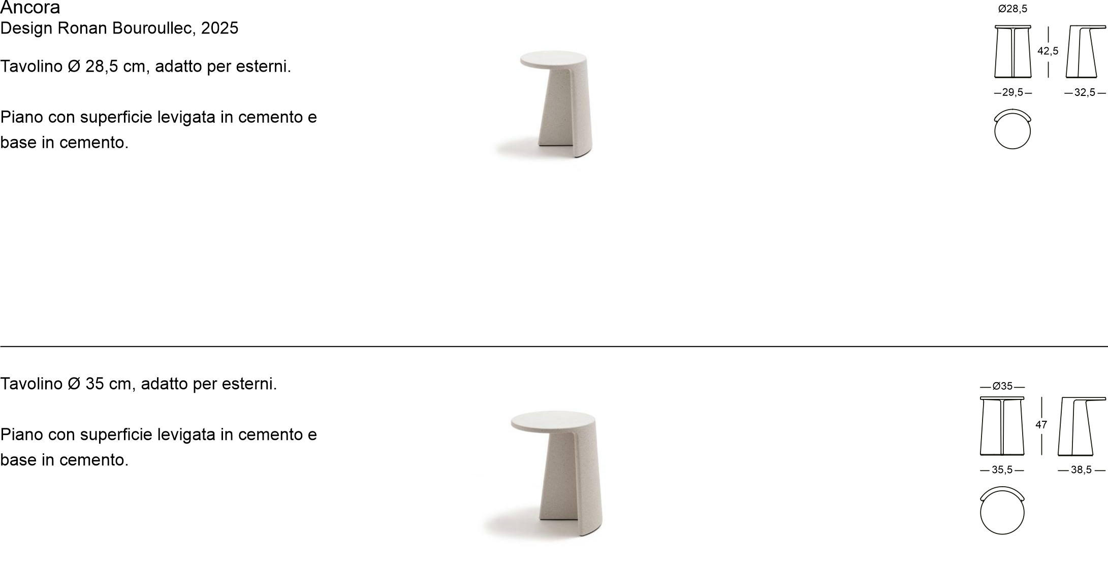Materiali: base in cemento. Piani in cemento levigato (adatti anche per esterni).
