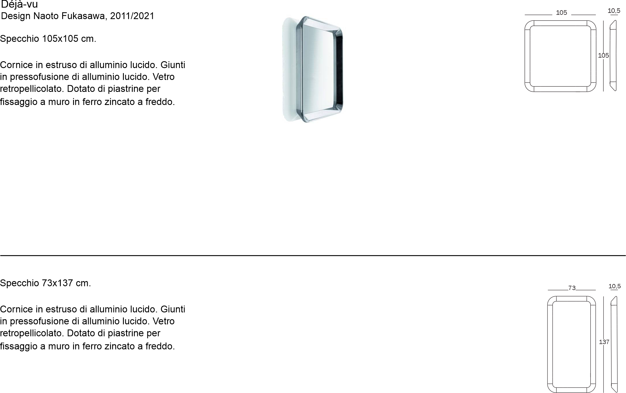 Materiali: cornice in estruso di alluminio lucido; giunti in pressofusione di alluminio; vetro retropellicolato.